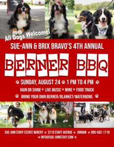 The Berner BBQ is a dog-friendly day of wines and canines at Sue-Ann Staff Estate Winery. Bring yourself and your dog (all dogs welcome, but most especially Bernese Mountain Dogs) to the winery for an afternoon of great wines, live music and new friends.